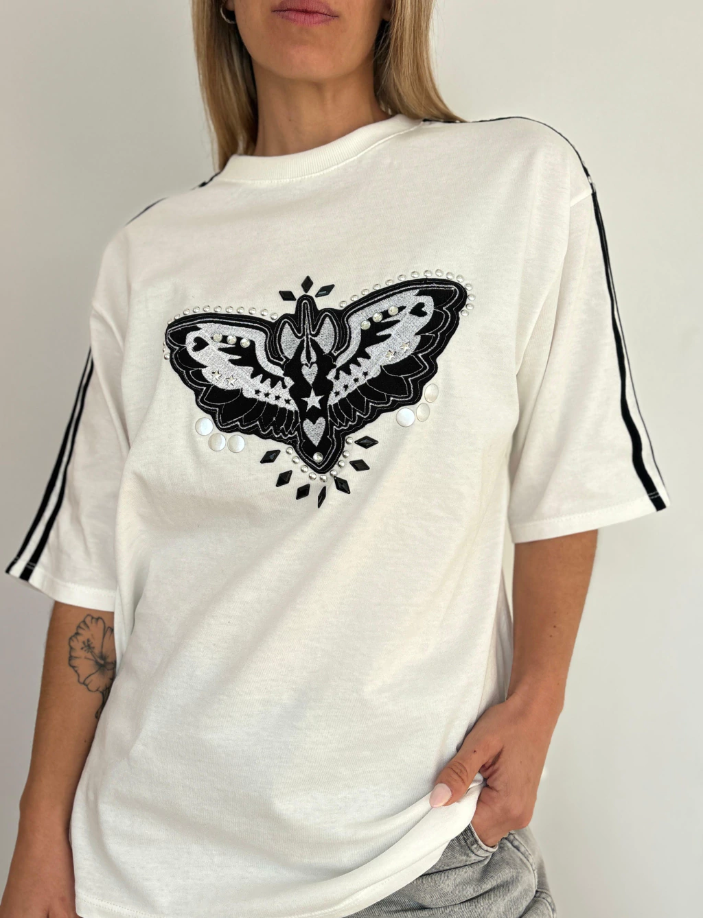 - Ideal para destacar tu estilo, esta remera combina la suavidad y la ligereza que necesitas para lucir esplendida!!. Su diseño incorpora una aplicación de estampa bordada acompañada de mix de tachas, brindando un toque de originalidad y distinción a tu look. Diseño exclusivo África design. TU